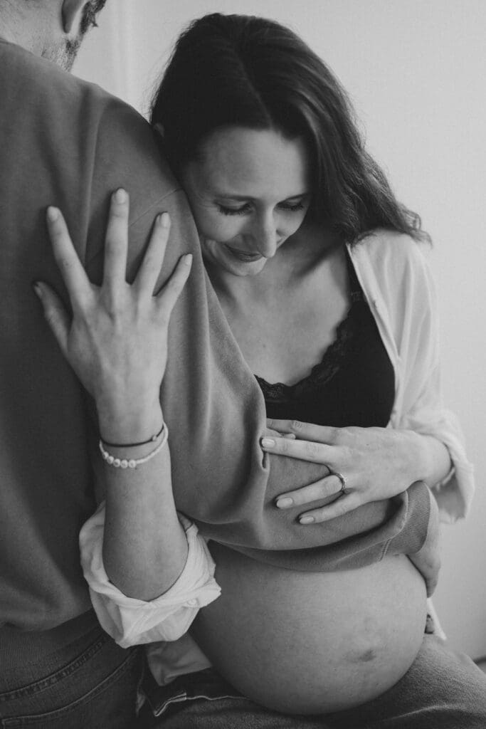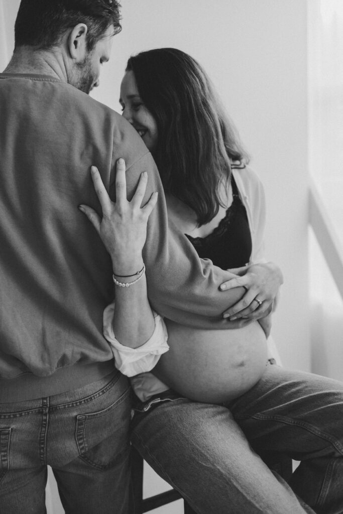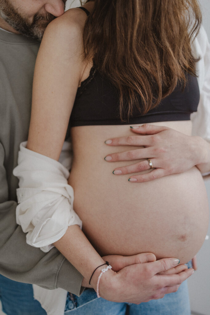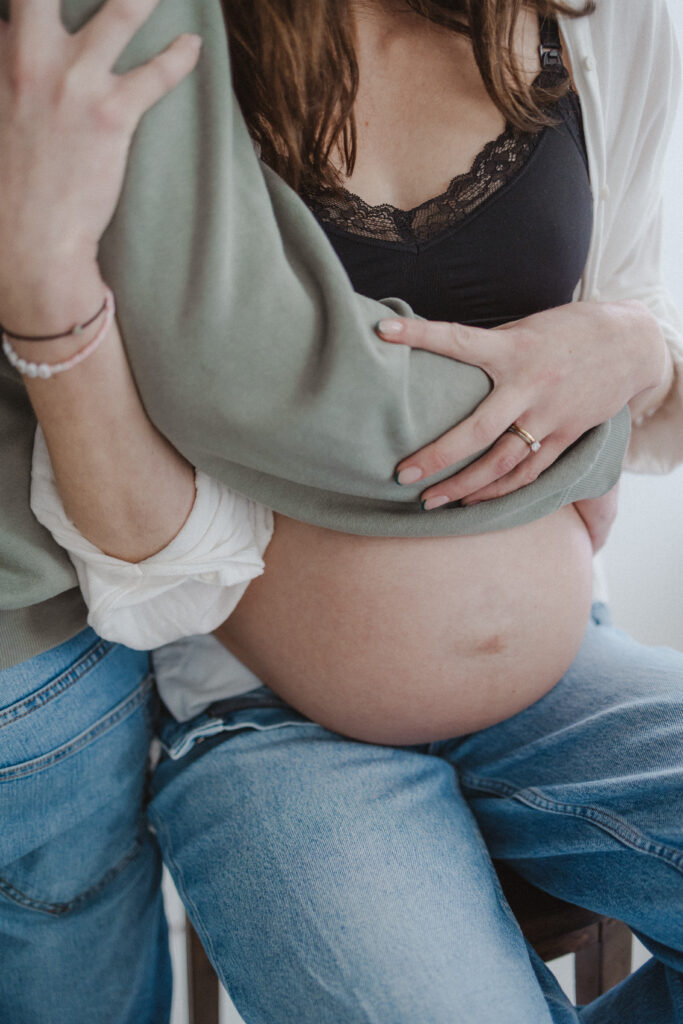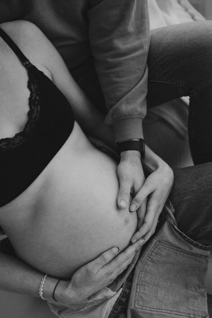 We focused mainly on mum. On her body. On the quiet strength and softness that comes with carrying a baby. Dad stepped in gently where it felt right, a hand on her back, a close cuddle, the shape of his arms framing her. He didn’t need to look at the camera to be part of the story.