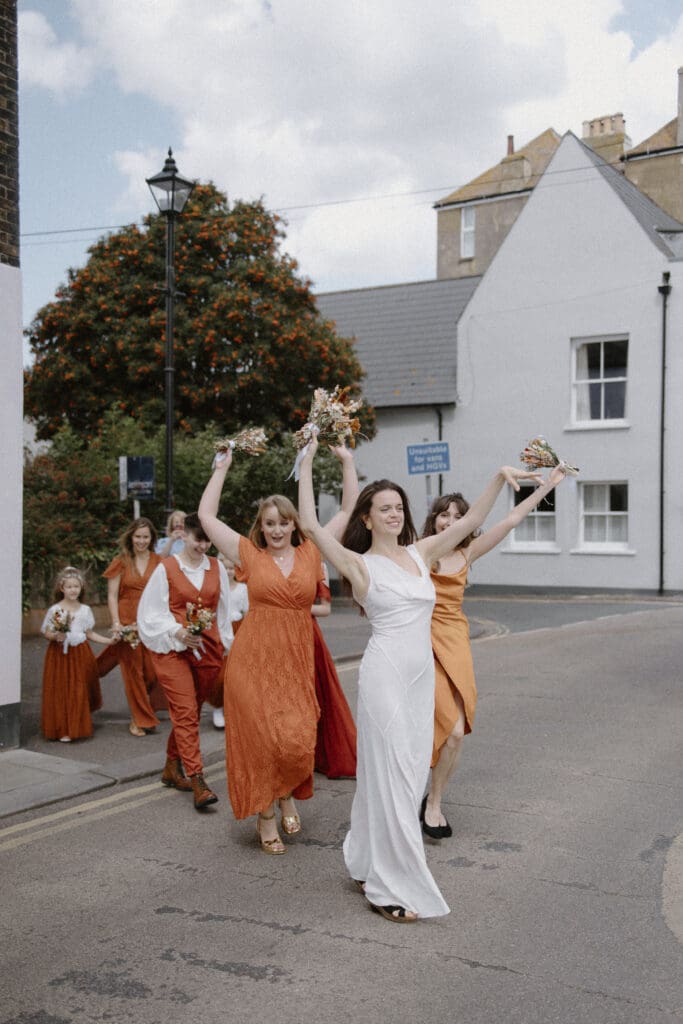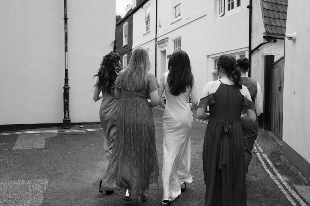 The day began in the heart of Deal, where Philippa kept bridal prep intentionally relaxed at her family home. The atmosphere was full of excitement, laughter, and just the right amount of nerves. Before heading to the venue, we took a stroll through the town and down to the seafront for some fun bridesmaid portraits on the beach, which happened to be one of my favourite moments of the morning.