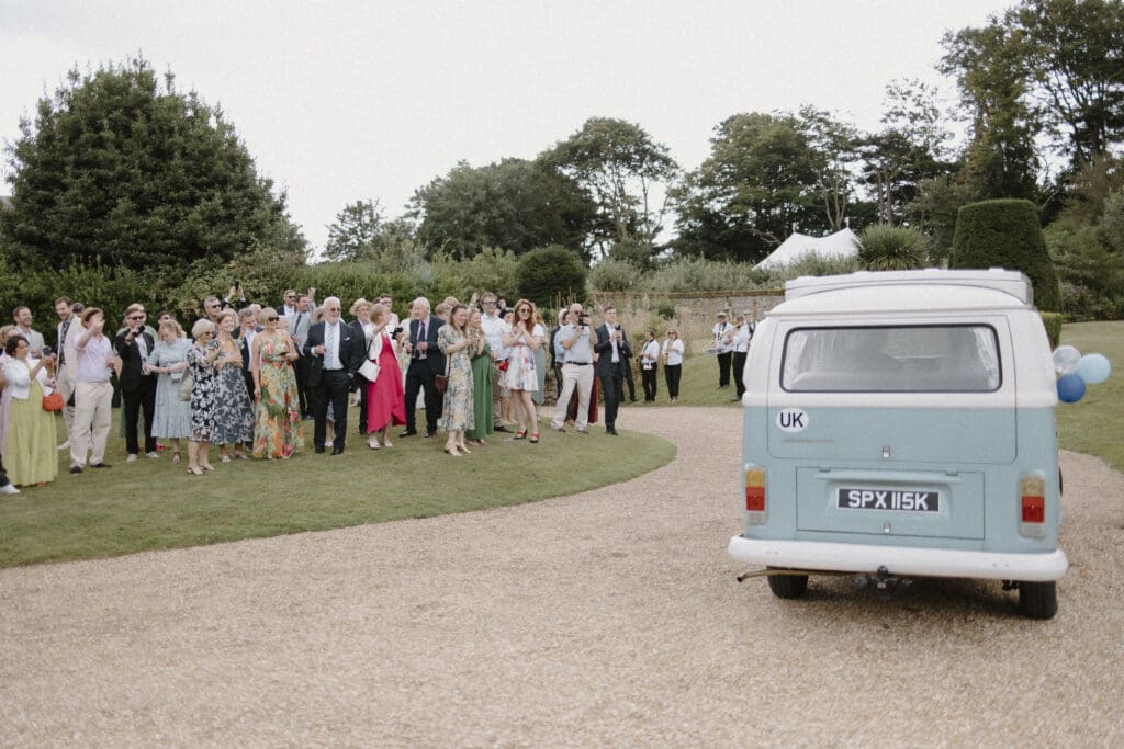 Philippa arrived with her dad in the most perfect baby blue VW bus, greeted with cheers and applause from guests.