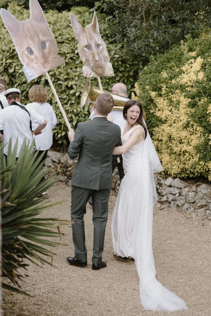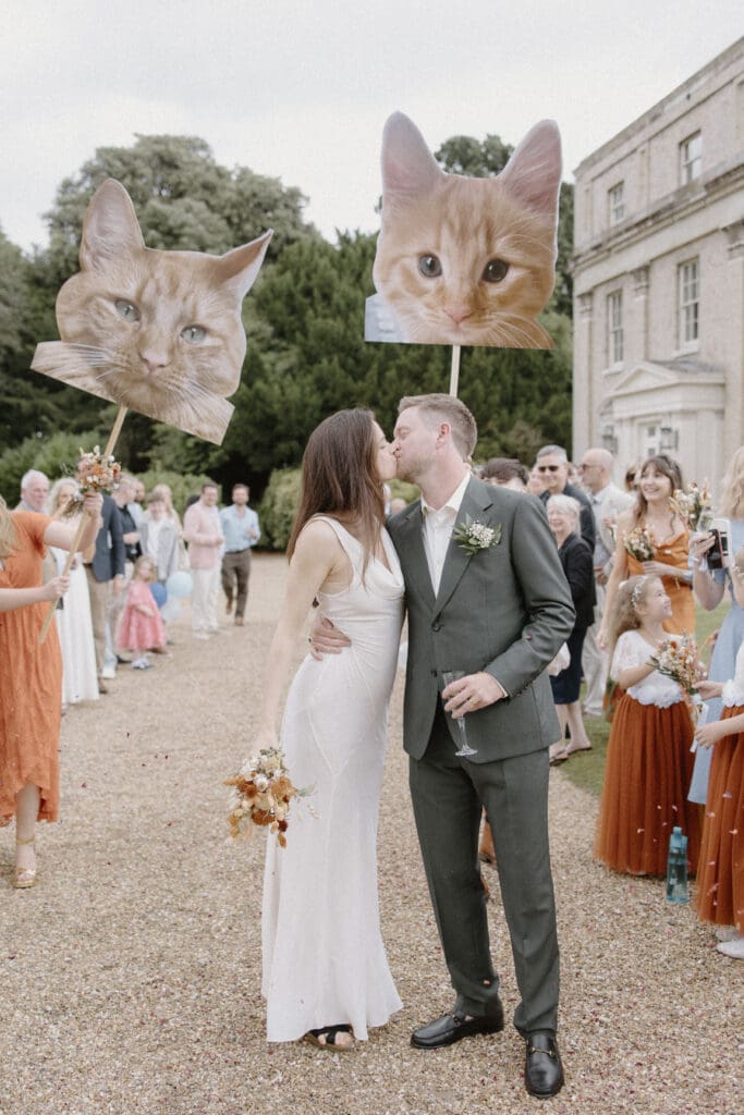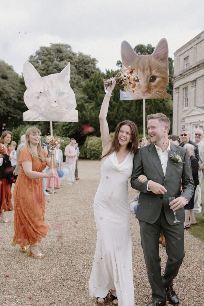 After the ceremony, Philippa and James made their way back up the aisle to the sound of their live band (The Native Oysters), before heading outside the main house for their confetti walk. Armed with giant placards of their much-loved cat, Janet! it quickly became one of the most joyful moments of the day.